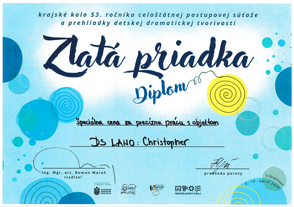 Inscenácia Christopher získal špeciálnu cenu za precíznu prácu s objektom, pedagóg Lucia Janovová.