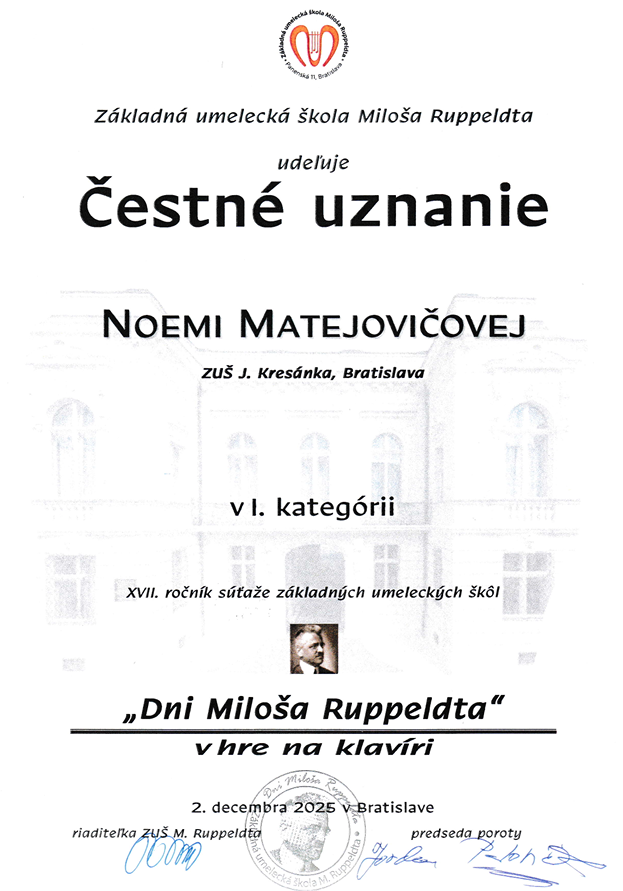 Na XVII. ročníku súťaže Dni Miloša Ruppeldta 2025 v hre na klavíri sa naši žiaci umiestnili: