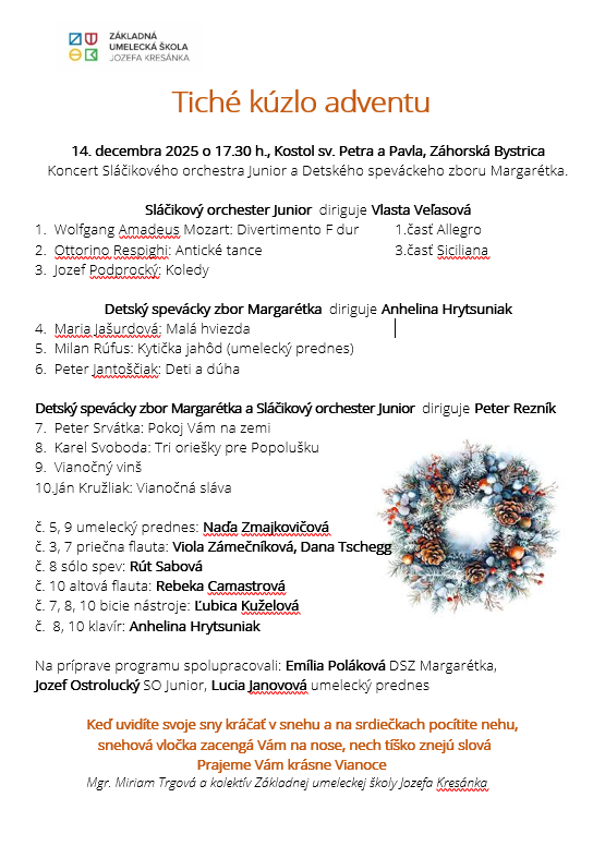 Dňa 14. decembra sa v Kostole sv. Petra a Pavla v Záhorskej Bystrici konal adventný koncert Tiché kúzlo adventu, na ktorom sa predstavil Sláčikový orchester Junior a Detský spevácky zbor Margarétka pod vedením Vlasty Veľasovej, Anheliny Hrytsuniak a Petra Rezníka. Umelecký prednes mala Naďa Zmajkovičová, žiačka literárno-dramatického odboru. Mladí hudobníci predviedli krásne vianočné melódie, ktorými navodili predvianočnú náladu a vyslúžili si dlhotrvajúci potlesk prítomných divákov.