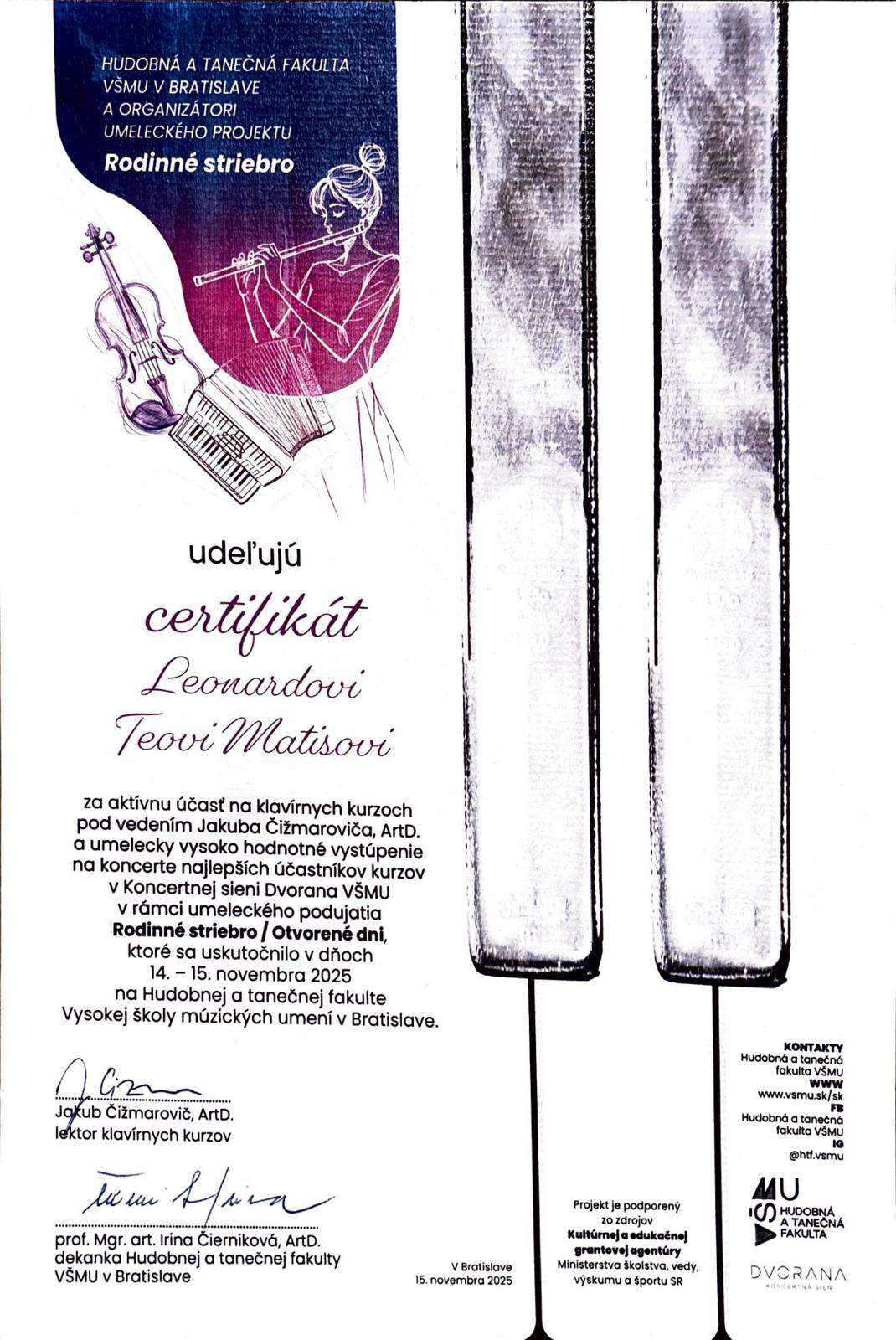 V dňoch 14. - 15. novembra sa uskutočnili interpretačné kurzy, prednáška a koncert na HTF VŠMU v Bratislave s názvom Rodinné striebro. Lektorom kurzov bol Jakub Čižmarovič. Z našej školy sa kurzov zúčastnil Leonard Teo Matis z klavírnej triedy Zuzany Patkoló, ktorý hral aj na slávnostnom výberovom koncerte.