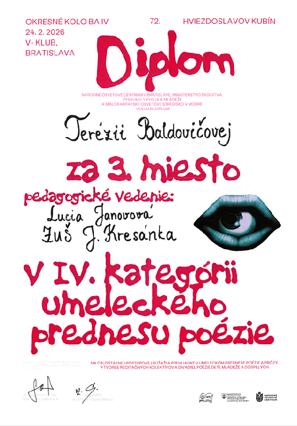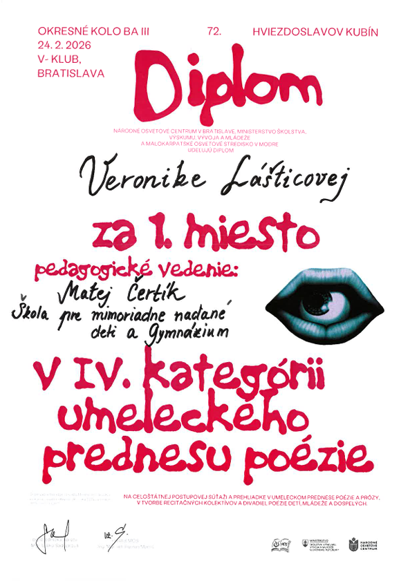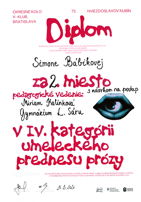 V dňoch 23.2-25.2.2026 sa konali vo V-klube na námestí SNP 12 v Bratislave okresné kolá 72. ročníka Hviezdoslavovho Kubína pre stredoškolákov a dospelých v prednese poézie a prózy v IV. a V. kategórii. Na súťaži sa zúčastnilo 16 študentov literárno-dramatického odboru, predviedli skvelé výkony a získali nasledovné ocenenia: