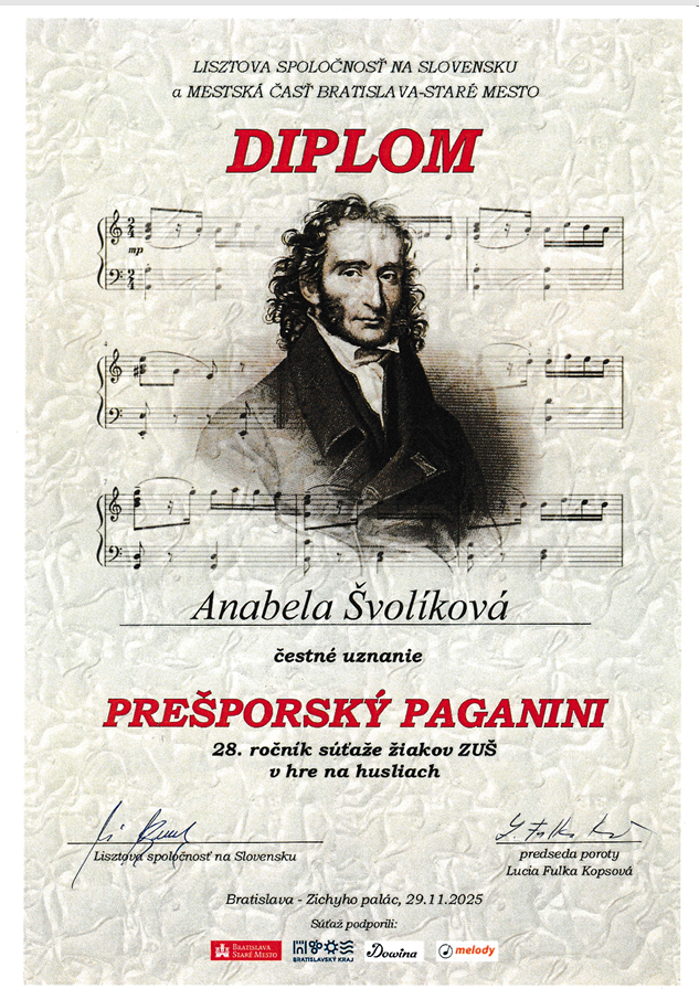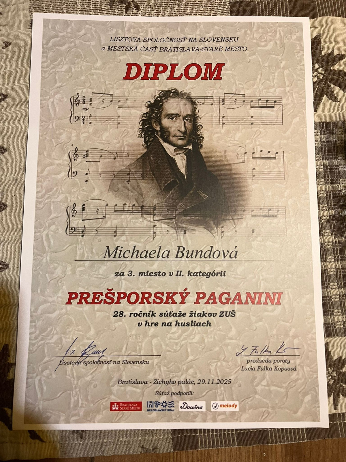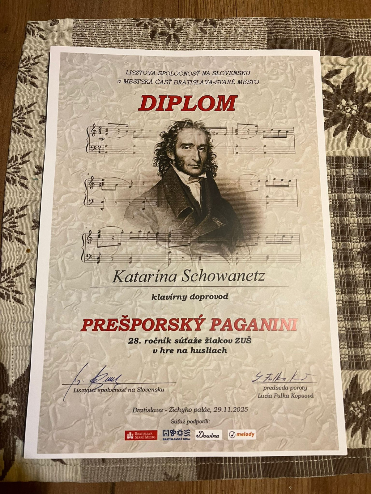Na 28. ročníku súťaže Prešporský Paganini dňa 29. novembra sa naši žiaci umiestnili: