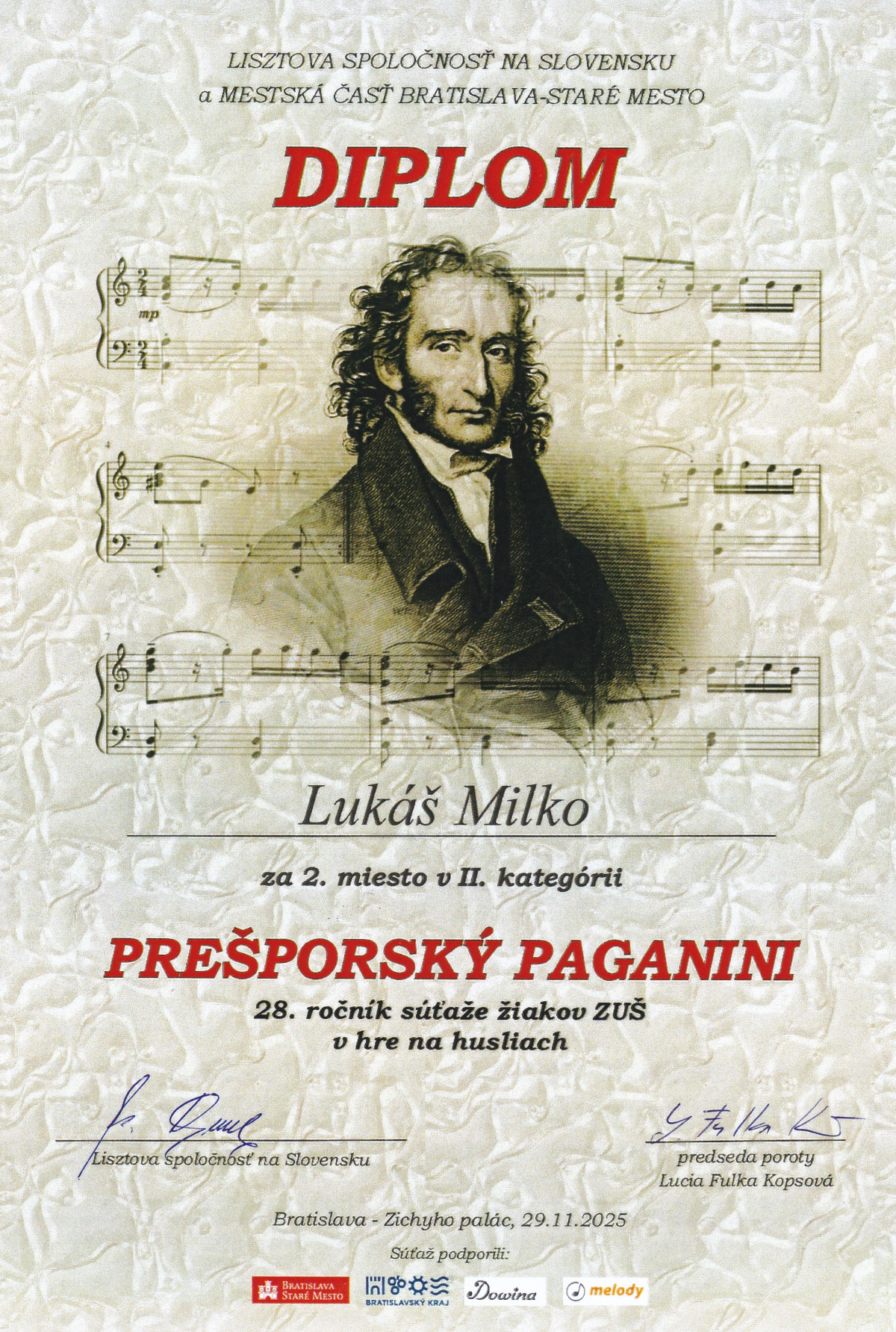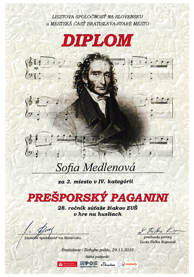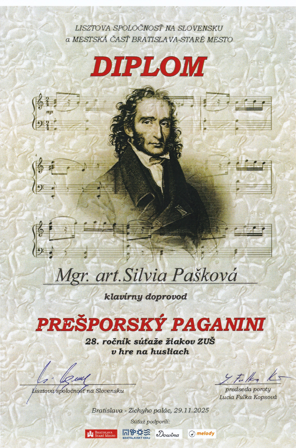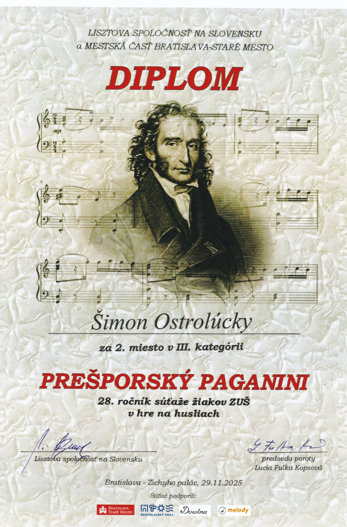 Na 28. ročníku súťaže Prešporský Paganini dňa 29. novembra sa naši žiaci umiestnili:
