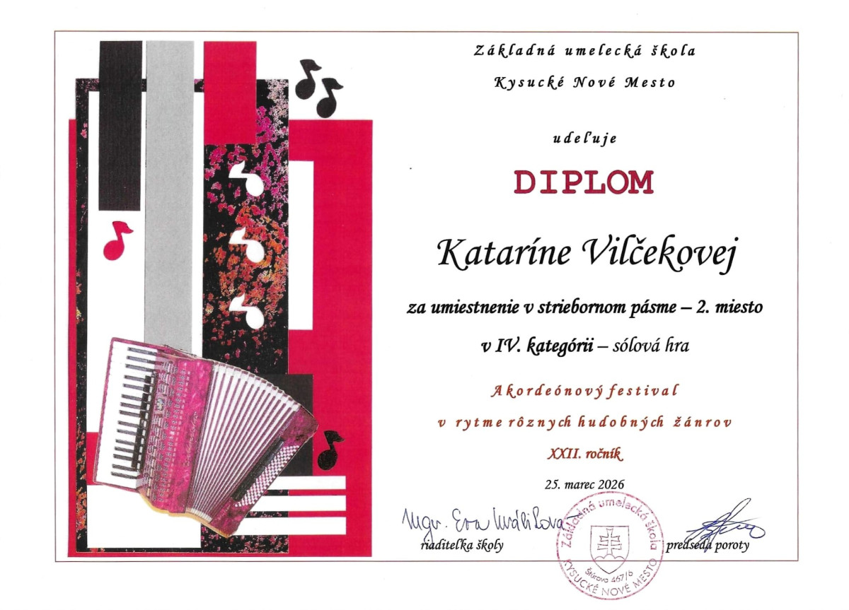 Na 22. ročníku akordeónového festivalu V rytme rôznych hudobných žánrov, ktorý sa konal 25. marca v Kysuckom Novom Meste sa naši žiaci umiestnili nasledovne:
