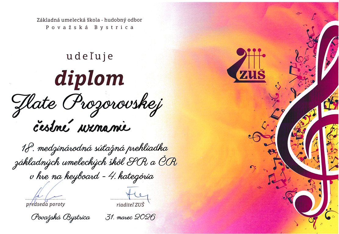 Zlata Prozorovská z triedy Vlasty Horečnej Konečnej získala na 18. medzinárodnej súťažnej prehliadke ZUŠ Slovenskej republiky a Českej republiky v hre na keyboard vo 4. kategórii Čestné uznanie. Súťaž sa konala 31. marca 2026 v ZUŠ Považská Bystrica.