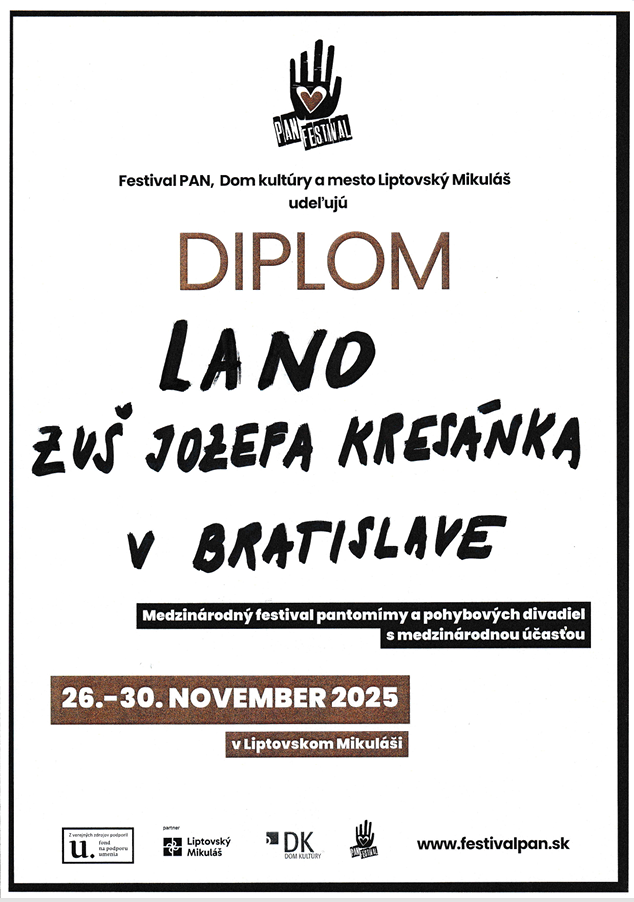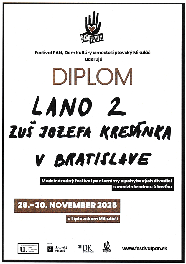 V dňoch 26. - 30.11.2025 sa pedagógovia a žiaci LDO zúčastnili medzinárodného festivalu pantomímy a pohybového divadla PAN v Liptovskom Mikuláši. V kategórii súborov našu ZUŠ reprezentovali inscenácia „The History Of The World In Ten Minutes“ s ročníkom 1.-3./II. v réžii Zuzany Strnátovej a získali Špeciálnu cenu za spracovanie vážnej témy v štýle hip-ezo-fight club show. V súťažnej kategórii o pohár improvizácie získali 3. miesto žiaci Dorota Šútovcová, Matúš Kralovič a Jaroslav Čertík z triedy 1.-3./II Zuzany Strnátovej. V súťažnej kategórii trojice skvelo reprezentovali ZUŠ žiačky z ročníka 2NS Mateja Feldbauera.