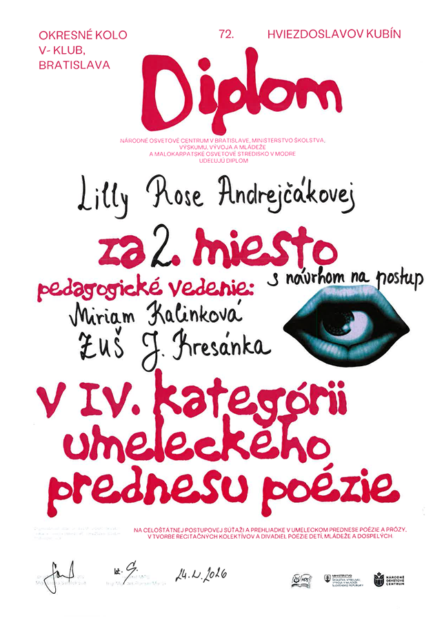 Lilly Rose Andrejčák, 2. miesto s návrhom na postup, pedagogička: Miriam Kalinková