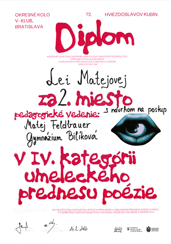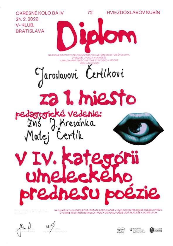 V dňoch 23.2-25.2.2026 sa konali vo V-klube na námestí SNP 12 v Bratislave okresné kolá 72. ročníka Hviezdoslavovho Kubína pre stredoškolákov a dospelých v prednese poézie a prózy v IV. a V. kategórii. Na súťaži sa zúčastnilo 16 študentov literárno-dramatického odboru, predviedli skvelé výkony a získali nasledovné ocenenia: