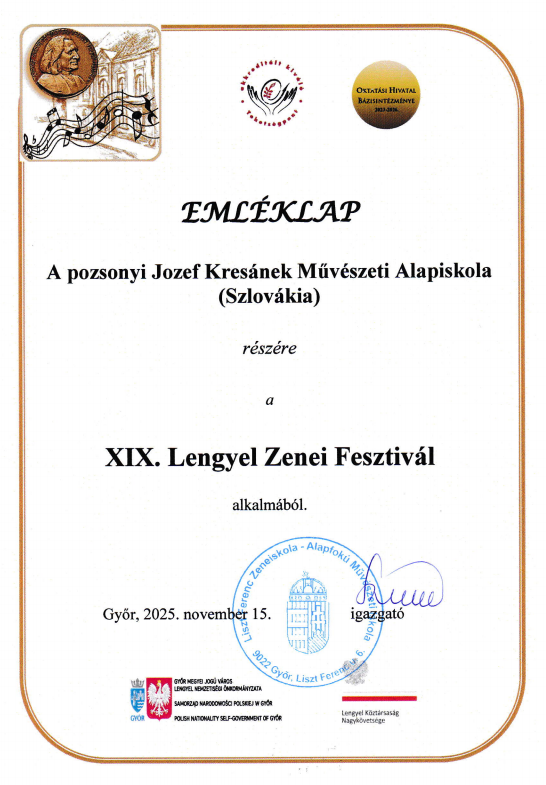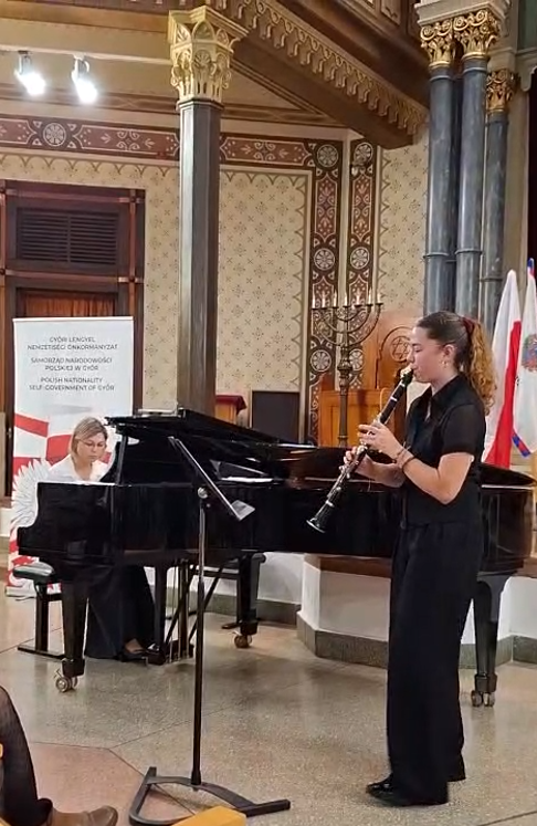 Dňa 15. novembra 2025 sa v maďarskom Györy konal 19. ročník medzinárodného Festivalu poľskej hudby. Na festivale našu školu reprezentovali Petra Slaninová, klavír z triedy Miriam Gašparíkovej a Nela Harmanová, klarinet z triedy Jarmily Jurášovej Šteigerovej v klavírnej spolupráci s Kseniou Argunovou. Festival sa konal v nádhernej synagóge, ďakujeme za medzinárodnú reprezentáciu žiakom aj ich pedagógom.