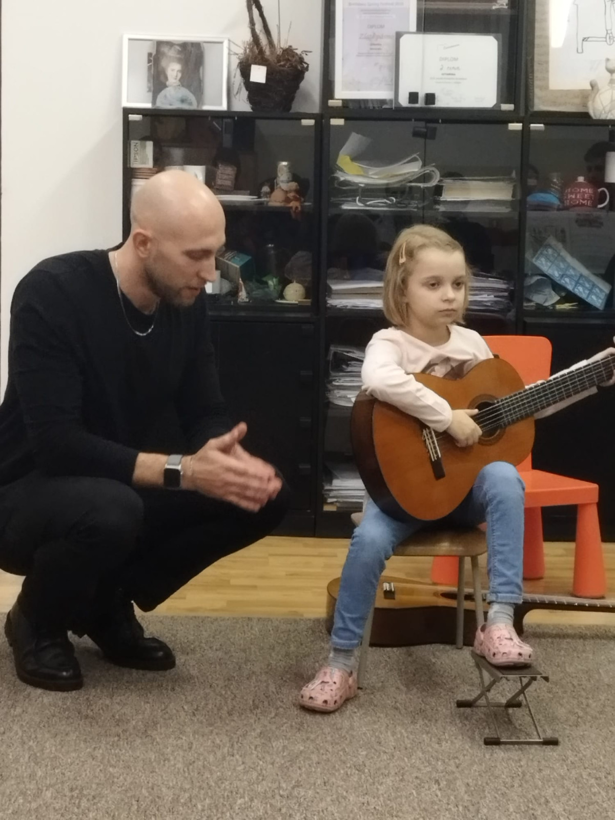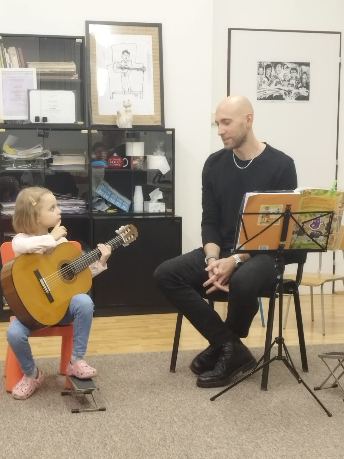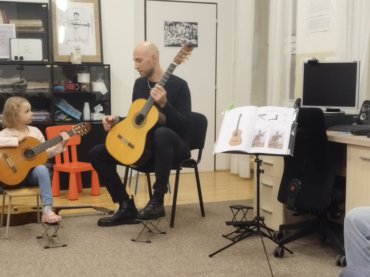 Náš kolega Oleksi Savko dňa 12. novembra 2025 na Karloveskej 3 realizoval so svojimi žiakmi prednášku „Začiatky hry na gitare“ pre kolegov zo strunového oddelenia.
