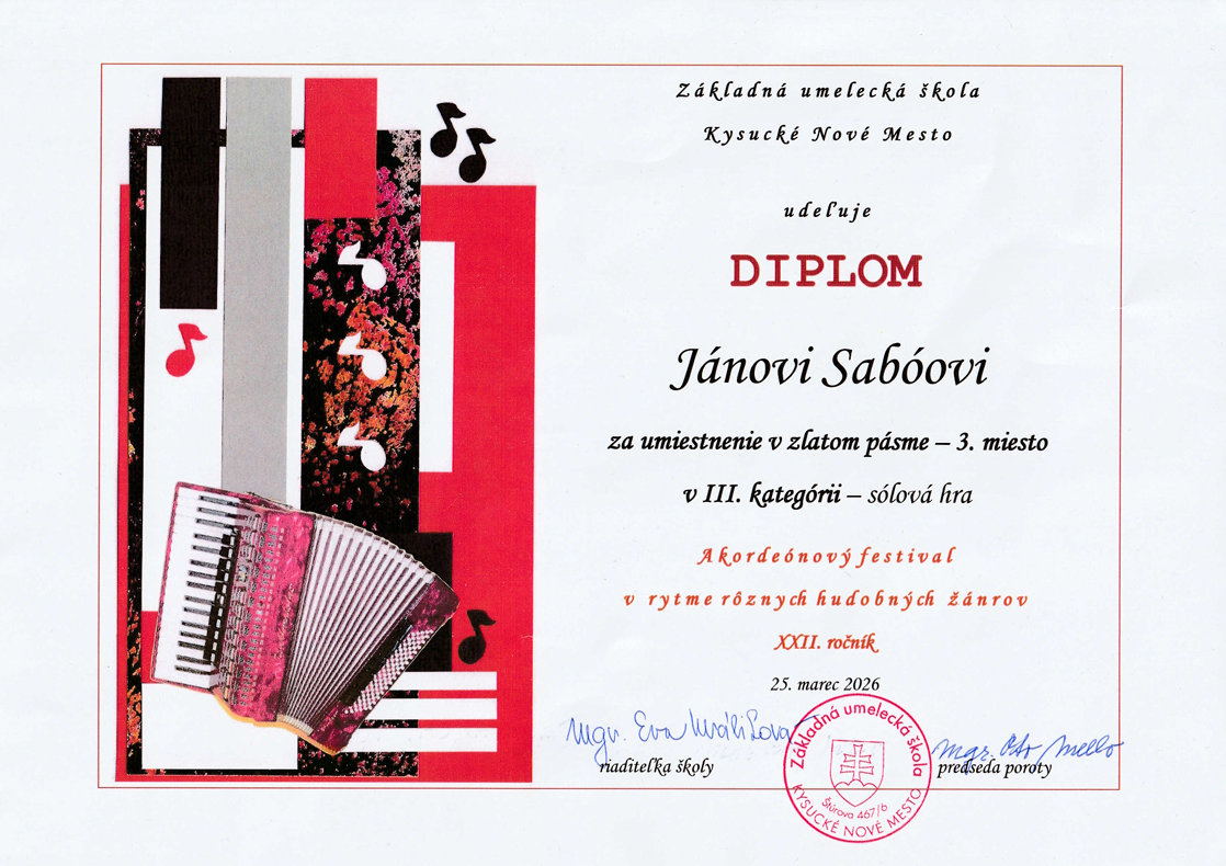 Na 22. ročníku akordeónového festivalu V rytme rôznych hudobných žánrov, ktorý sa konal 25. marca v Kysuckom Novom Meste sa naši žiaci umiestnili nasledovne: