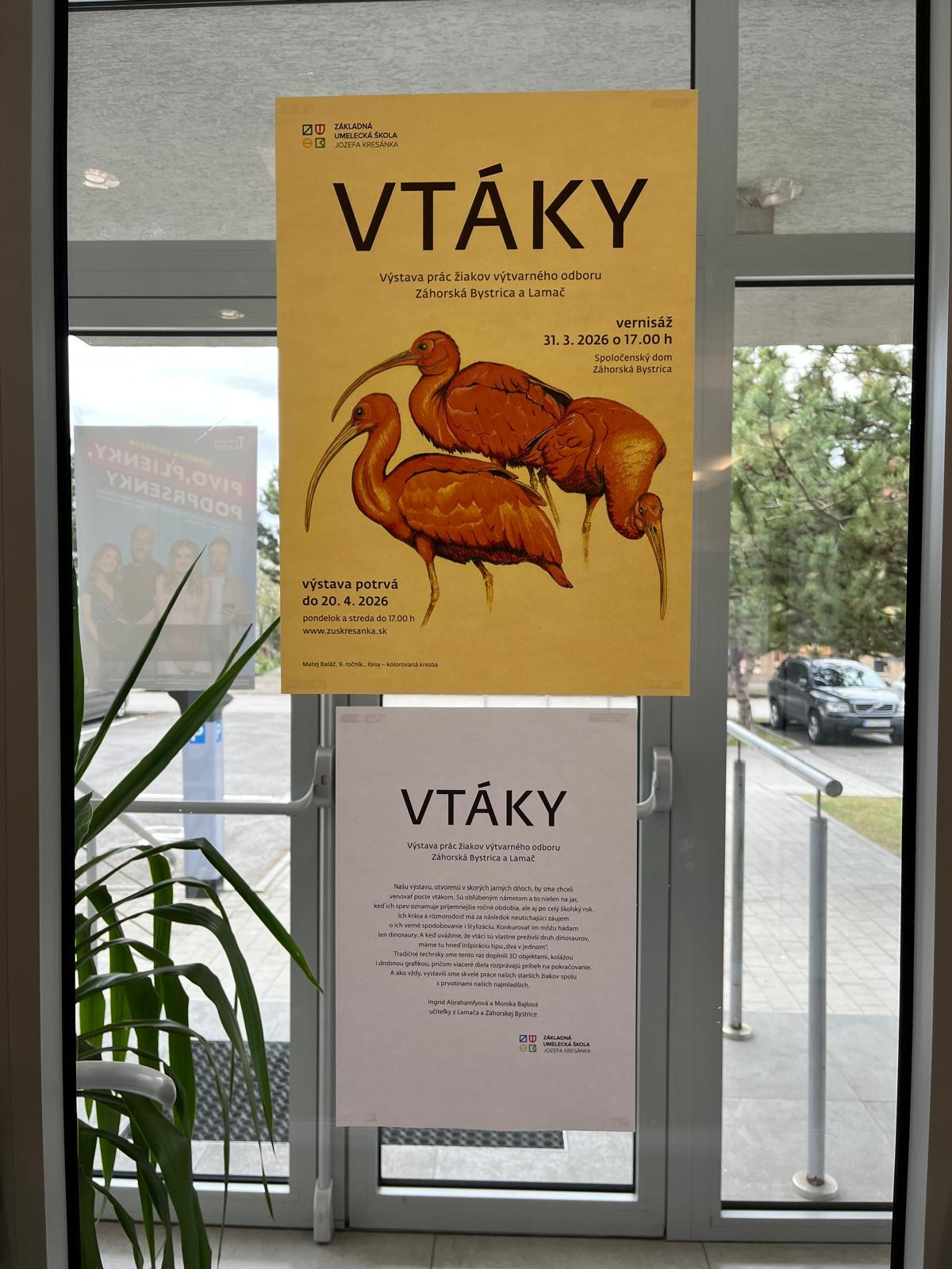 V utorok 31. marca sa v Spoločenskom dome v Záhorskej Bystrici konala vernisáž výstavy prác žiakov výtvarného odboru zo Záhorskej Bystrice a Lamača z tried pani Ingrid Abrahamfyovej a Moniky Bajlovej s názvom Vtáky. Na vernisáži účinkovali žiaci a pedagógovia hudobného odboru zo Záhorskej Bystrice a tiež Detský spevácky zbor Kresánik. Výstava potrvá do 20. apríla 2026.