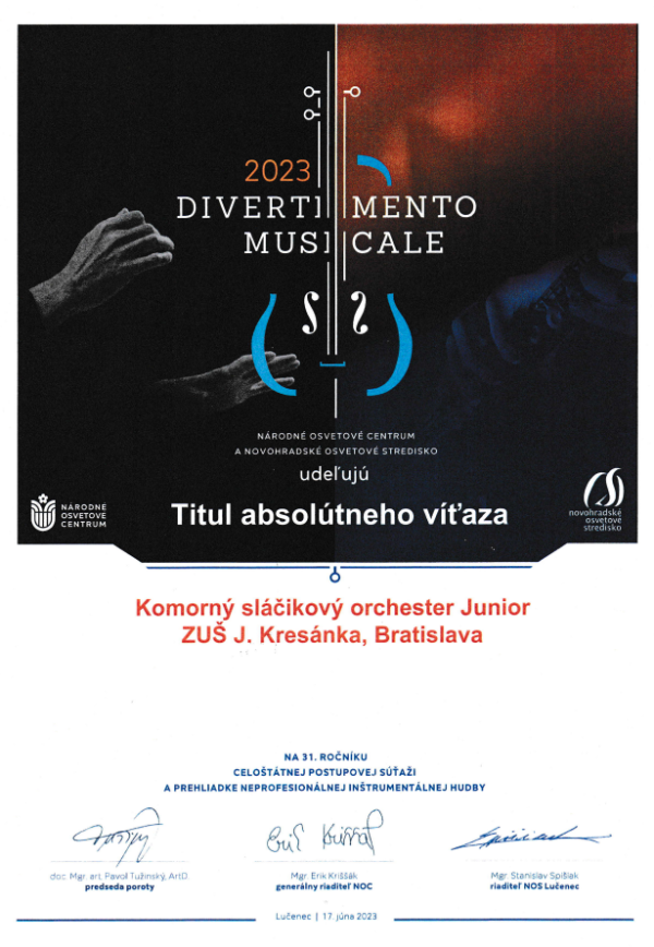 Dňa 17.6.2023 získal Sláčikový orchester Junior Zlaté pásmo, Titul absolútneho víťaza, Cena primátorky mesta Lučenec za dramaturgiu súťažného repertoáru na 31. ročníku celoštátnej postupovej súťaži a prehliadke neprofesionálnej inštrumentálnej hudby Divertimento musicale 2023. Na 12. ročníku medzinárodného mládežníckeho hudobného festivalu Bratislava 2023 v dňoch 5. - 8.7.2023 získal orchester Zlaté pásmo v kategórii Mládežnícke orchestre do 21 rokov: Sláčikové orchestre.